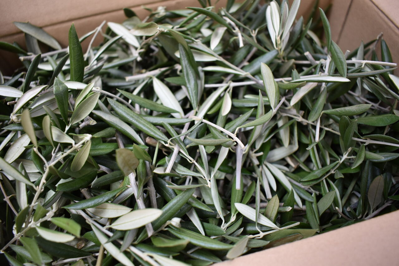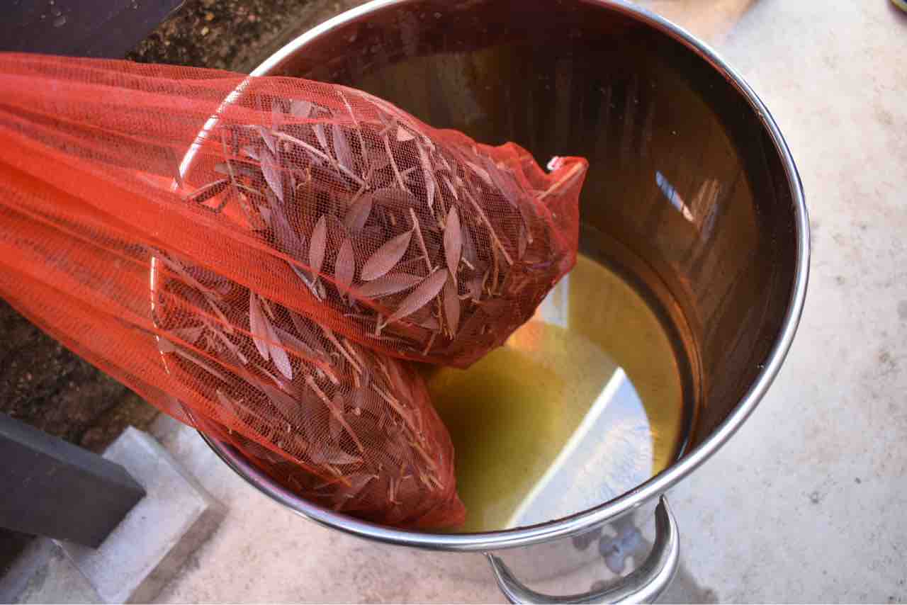 ①毛糸量(200g)の5倍のオリーブの枝葉(1kg)をネットに入れます。