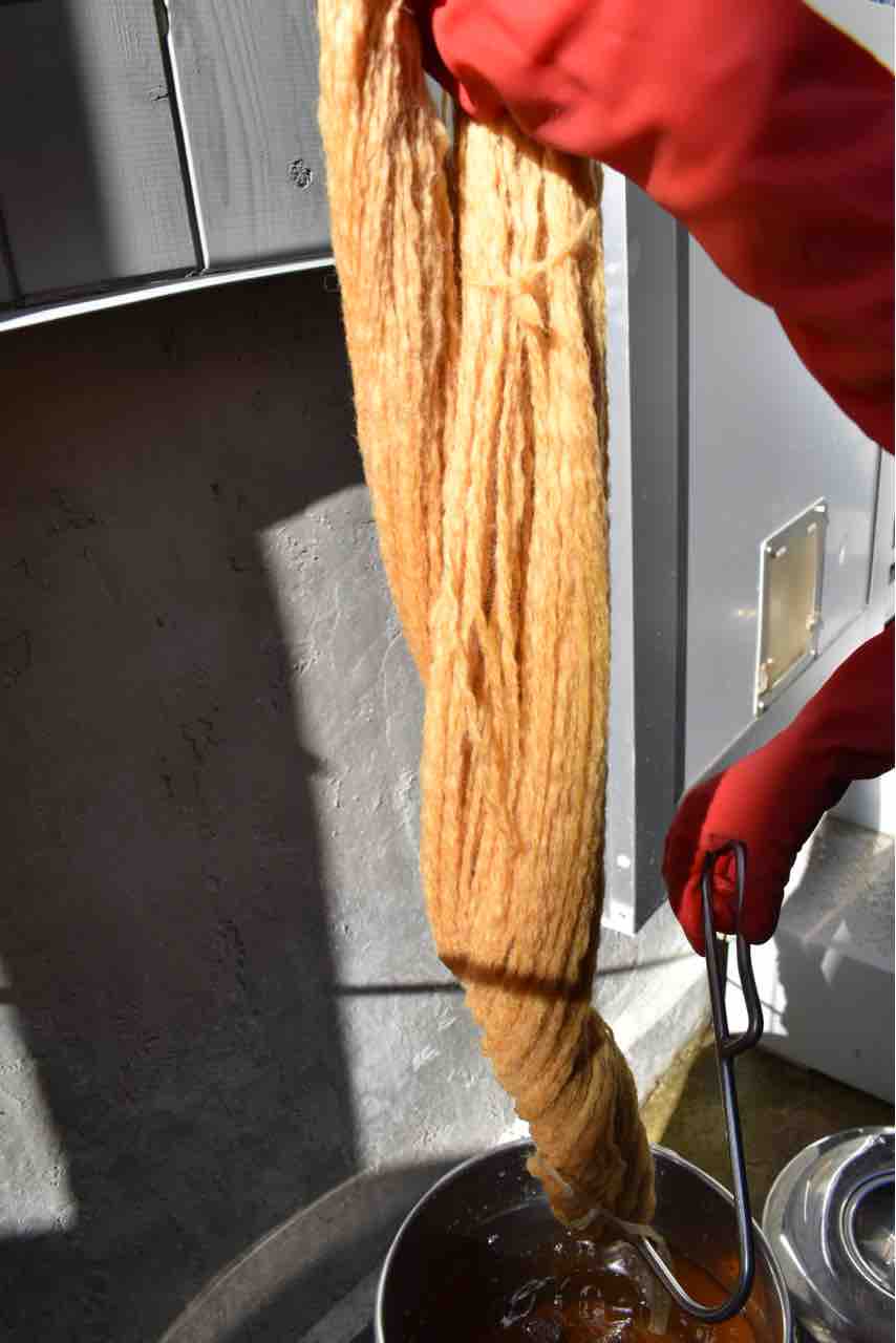 この時、毛糸のカセを上下にゆっくり動かし、染めムラができないようにします。