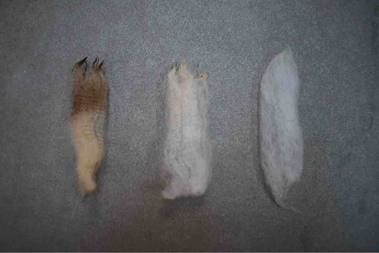 こちらがモノゲン液に入れる前と洗毛が完了後の原毛の状態です。