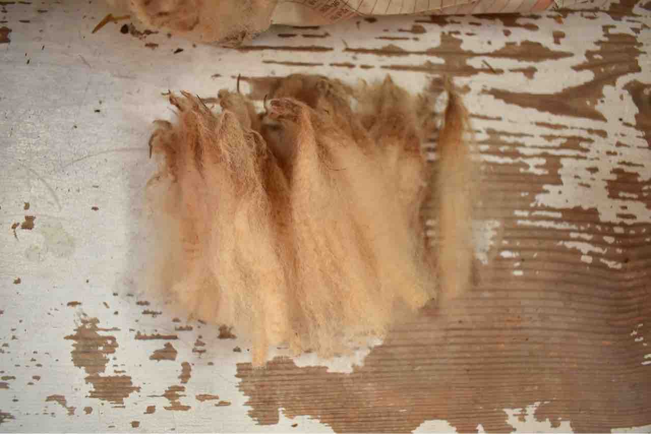 約3年前に購入した原毛なので、脂がまわって汚れているのが分かります。