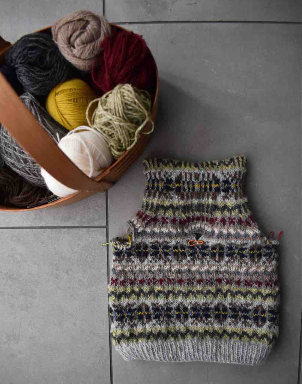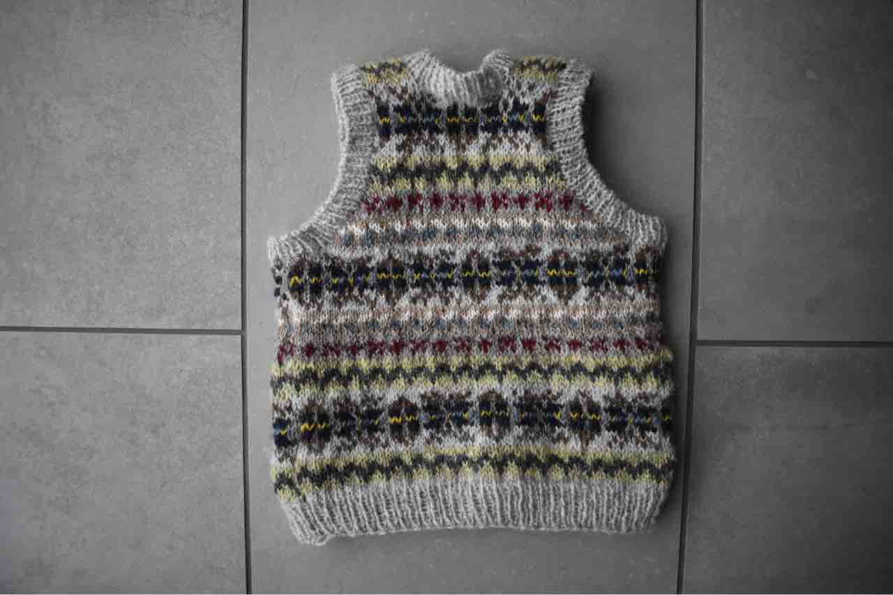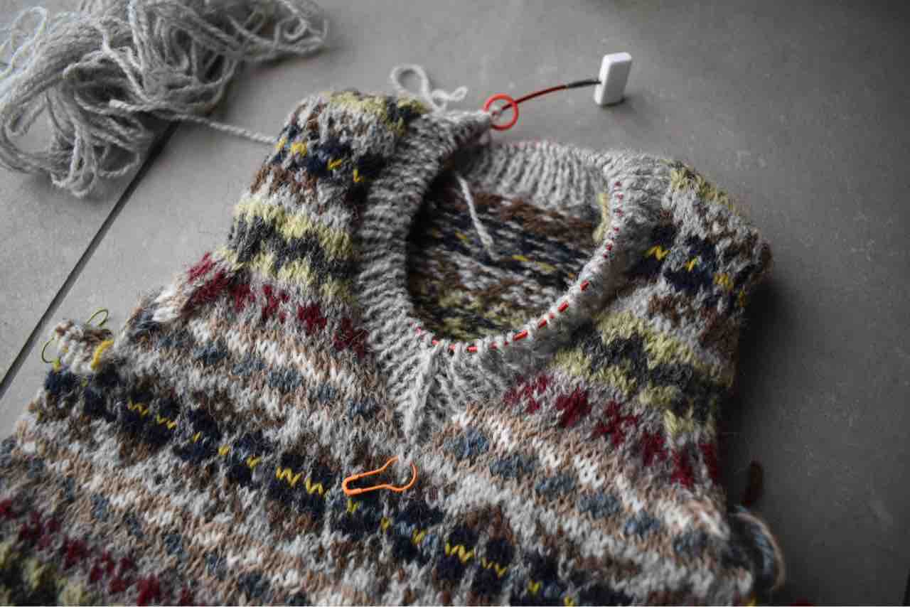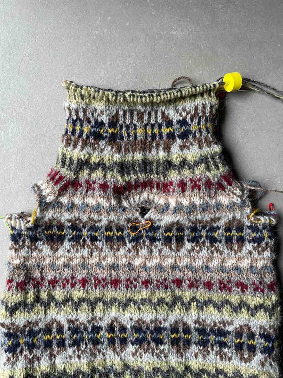 ベストが袋状になりました。 フェアアイルは模様編みをずっと輪で編み続けられる点では良いものの、スティークを編むので作品が形になった時に試着できないのが、悲しい点です。