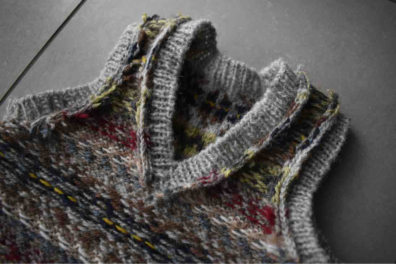 フェアアイルは、1段に2色以上の編み込み模様を編むので輪で編みながら、ベストの場合はVネックや袖口、後身頃衿ぐりにスティークと呼ばれる2色の縞模様を編みます。