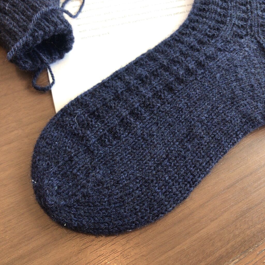 かかとのフラット部分から目を拾って、足の甲と底をぐるぐる減目しながら