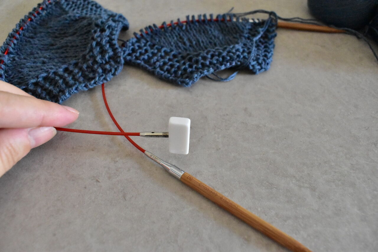 後ろ見頃を編み始めるときにコードとコードをつなぎ合わせて、前見頃に使用していた針を